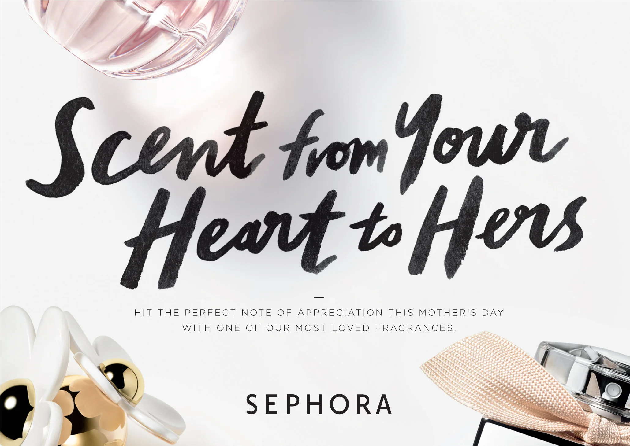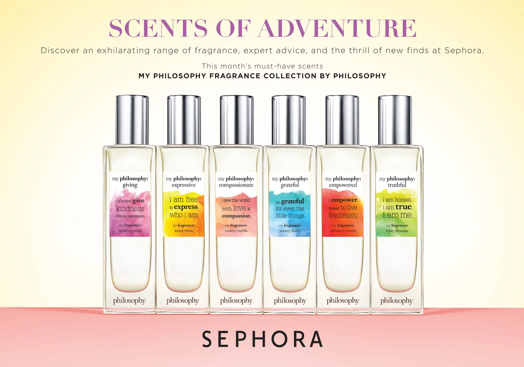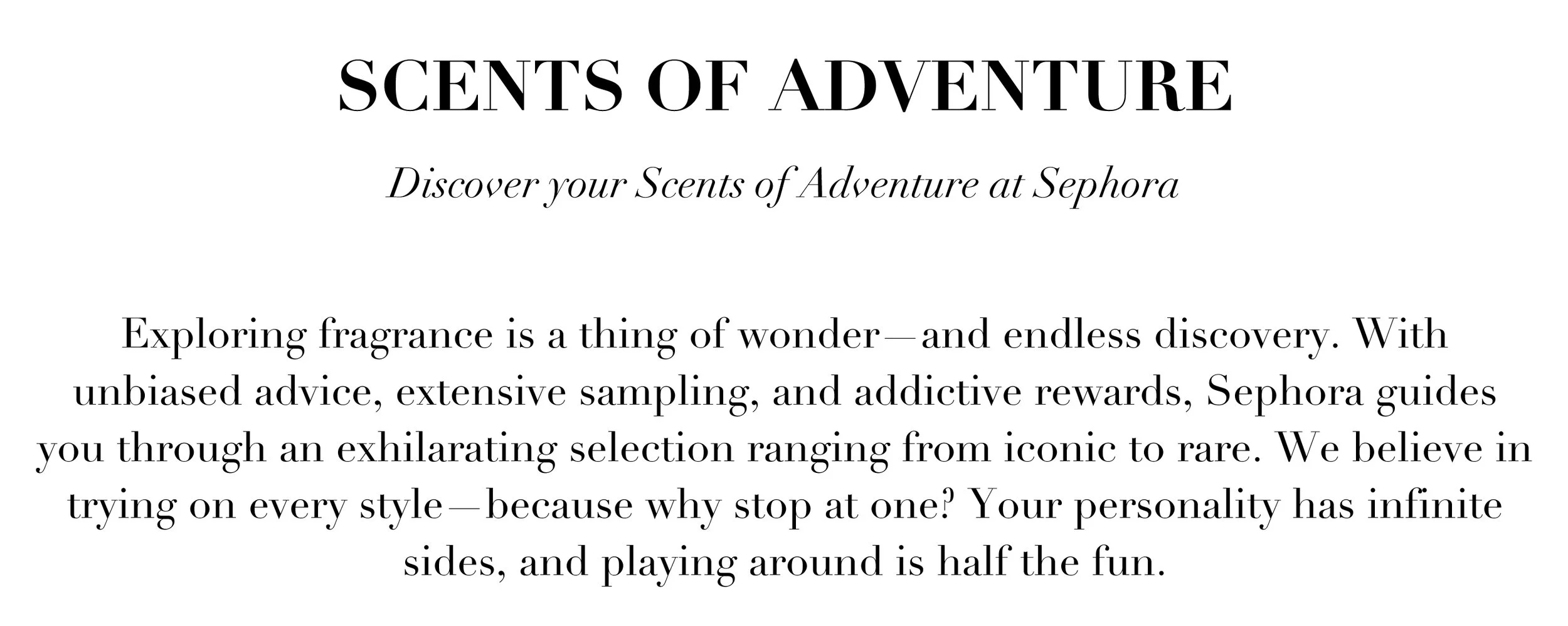 I developed, concepted and wrote Sephora's brand positioning for fragrance. Because 75% of Sephora shoppers don't know that Sephora sells fragrance, the campaign's aim was first and foremost to increase awareness and encourage engagement. The overarching concept Scents of Adventure guided fragrance marketing, while Stories Told in Scent was specifically created for niche fragrances.